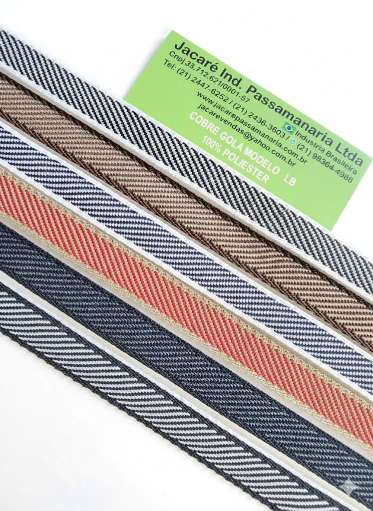 Cobre Gola ou galão fabricado em 100% poliester. Ponto fino e delicado, pode ser fabricado em desenho conforme figura ou totalmente liso (uma unica cor). Varias Larguras. Bobinas 100 metros.